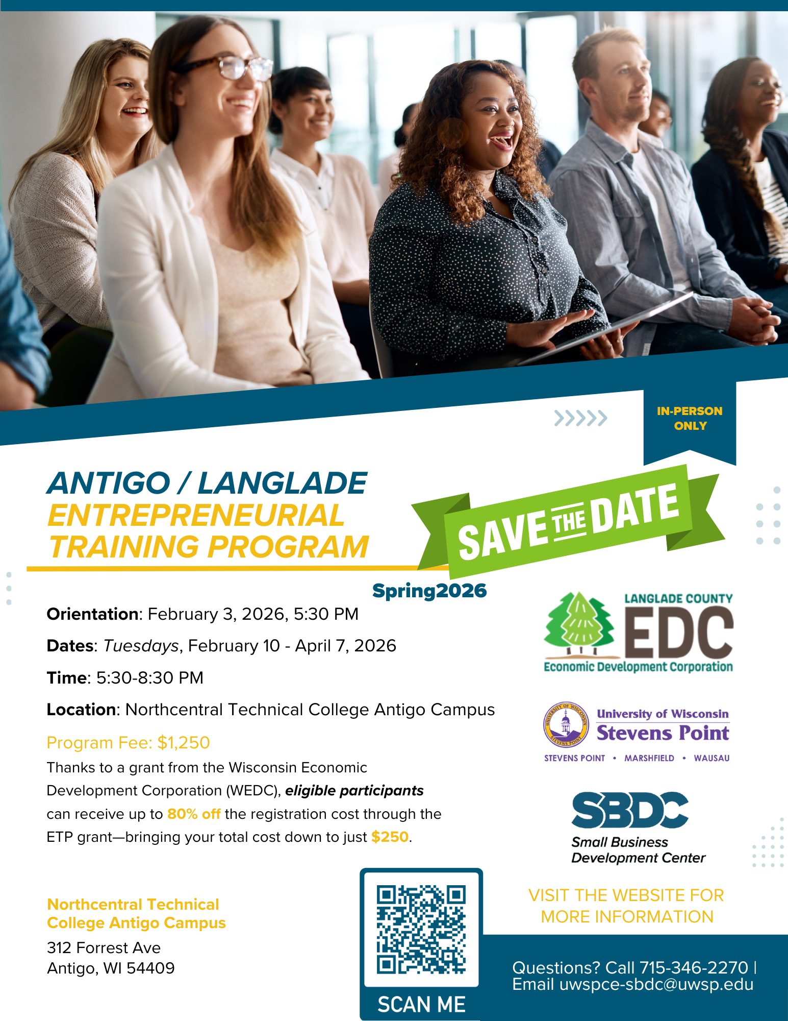 Is Entrepreneurship for you? The Langlade County Economic Development Corporation offers a 9-week Entrepreneurship Training Program on Tuesdays from February 3 to March 31 from 5:30 to 8:30 pm to write your business plan while learning about financials and marketing. Classes will be in person at the Langlade County Economic Development Corporation’s office located on the NTC Antigo Campus at 312 Forrest Avenue in room WT-112. For more information on the Entrepreneurial Training Course, click here to download the flyer or check out the Entrepreneurship Program page.