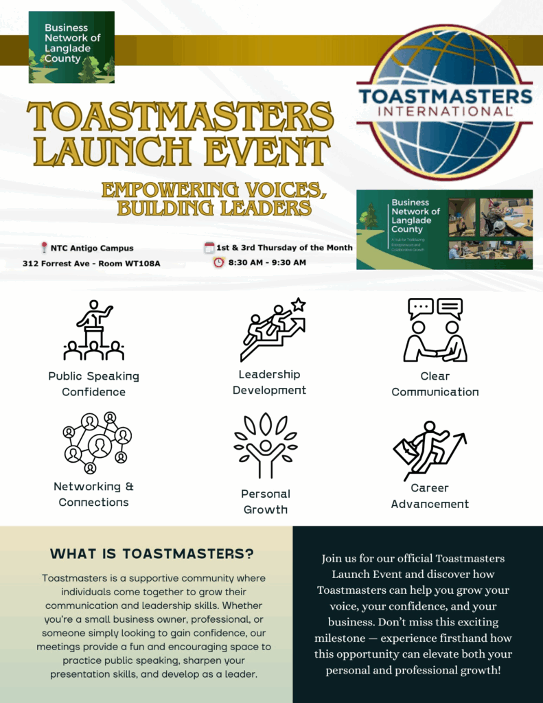 Join Langlade County’s Toastmasters International! Toastmasters meets at the following time and location: